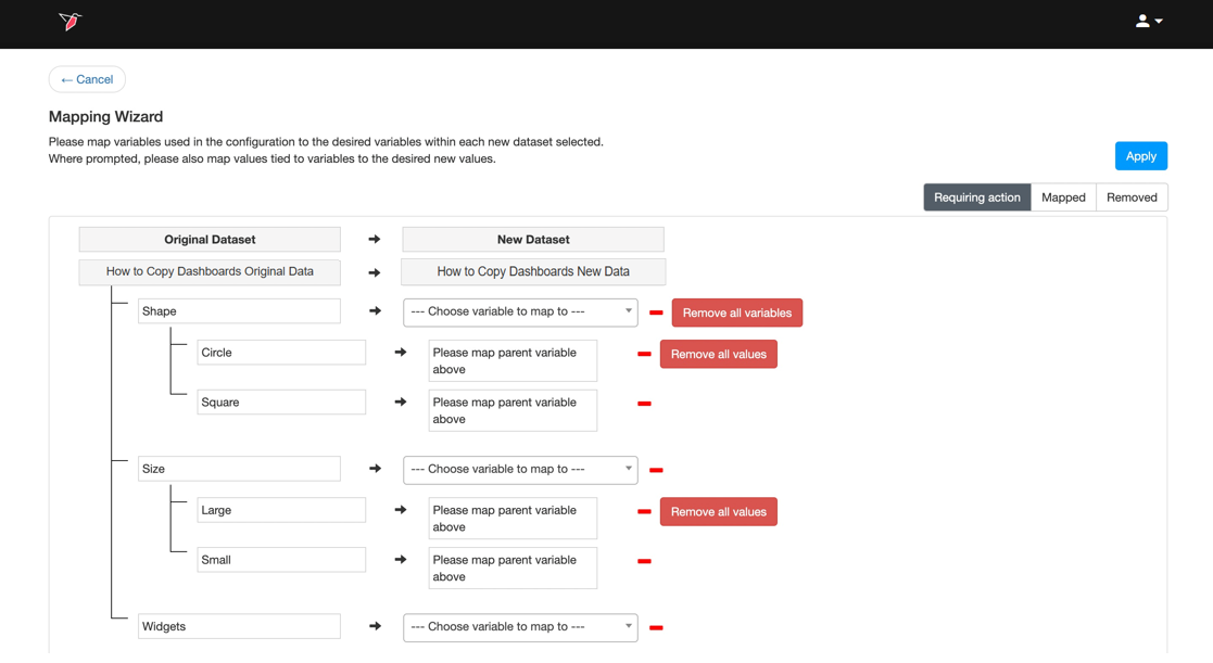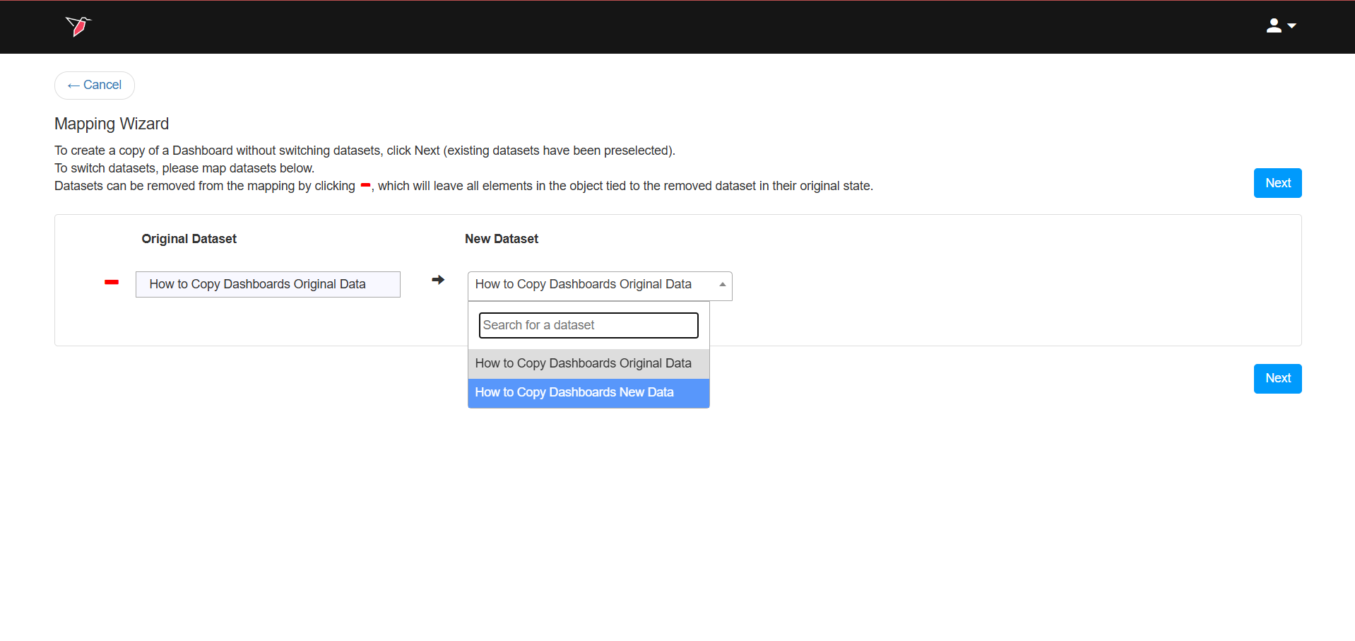 - Once you paste the dashboard, the Mapping Wizard page will open and you can map the new dataset to the new dashboard. Select the dataset you want to use to update your new dashboard from the New Dataset dropdown.