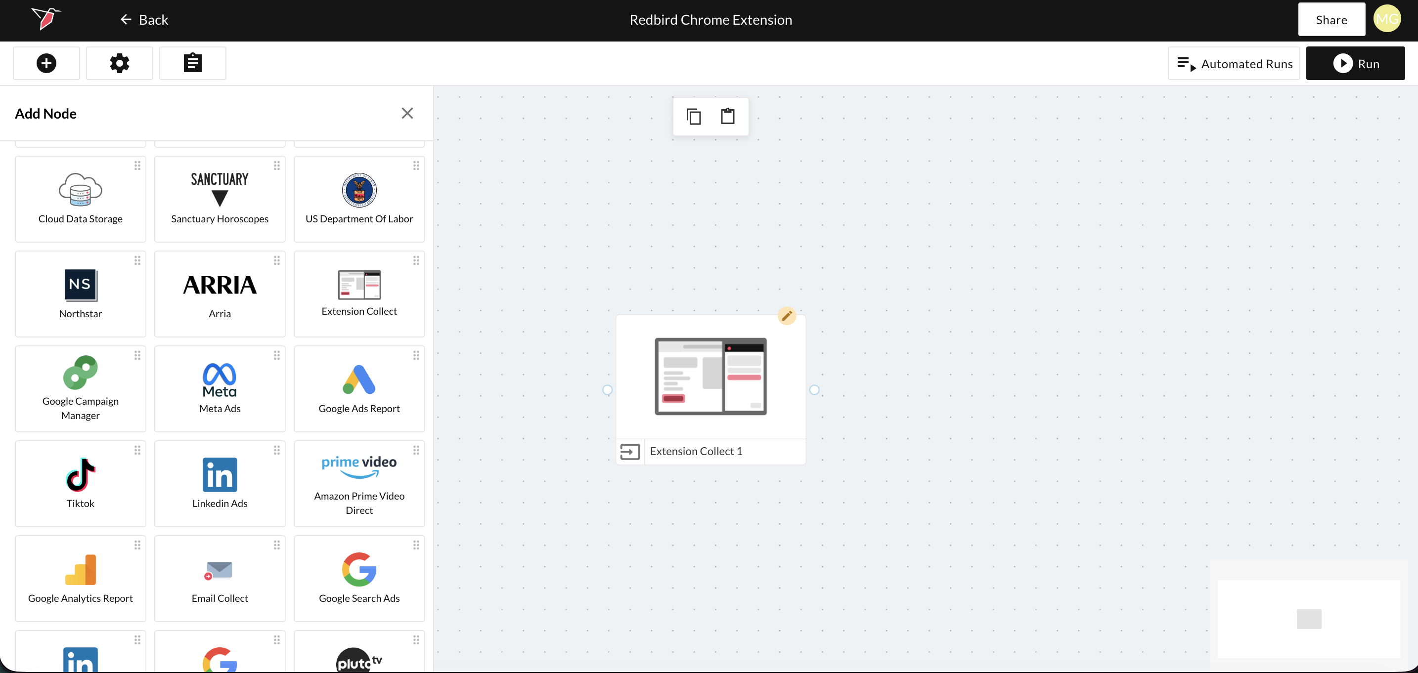 - In the canvas view, drag and drop the Extension Collect app from the Inputs section of the left-side panel. Then double-click to edit.