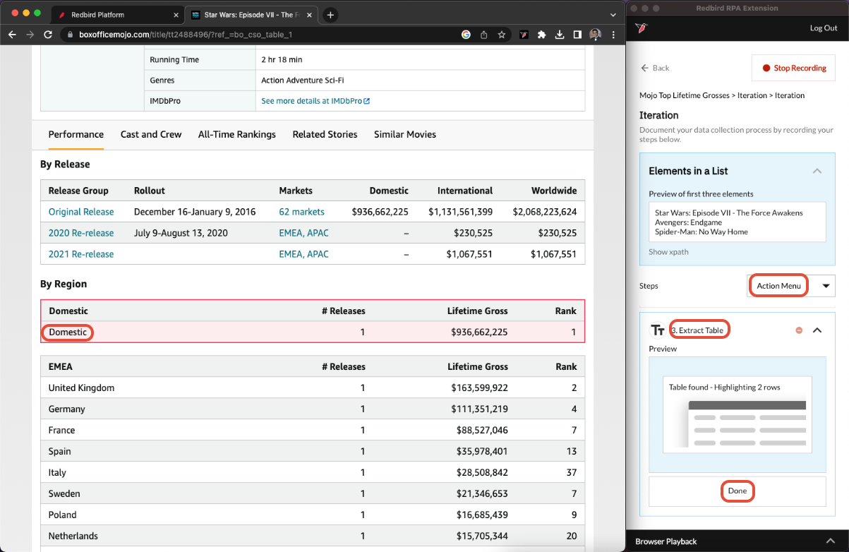 We can also extract a table and its contents. Click Action Menu > Extract Table. Now scroll down on the website till you see the By Region, Domestic table. Click on the part where it says Domestic in the data row. Redbird will auto-detect the table just by clicking one of the cells and specifying it in the preview. Click Done.