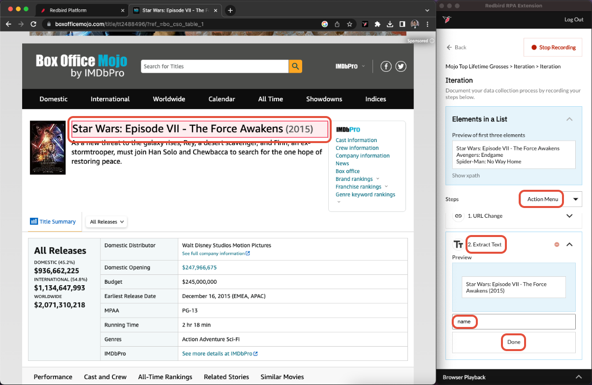 Let's begin by extracting text. Select the Action Menu > Extract Text. Expand the newly created Extract Text field and then on the website, hover over the movie name and click it once it is highlighted red. This will show in the RCE preview. Give the column a name. In this case, we can call it name. Click Done.