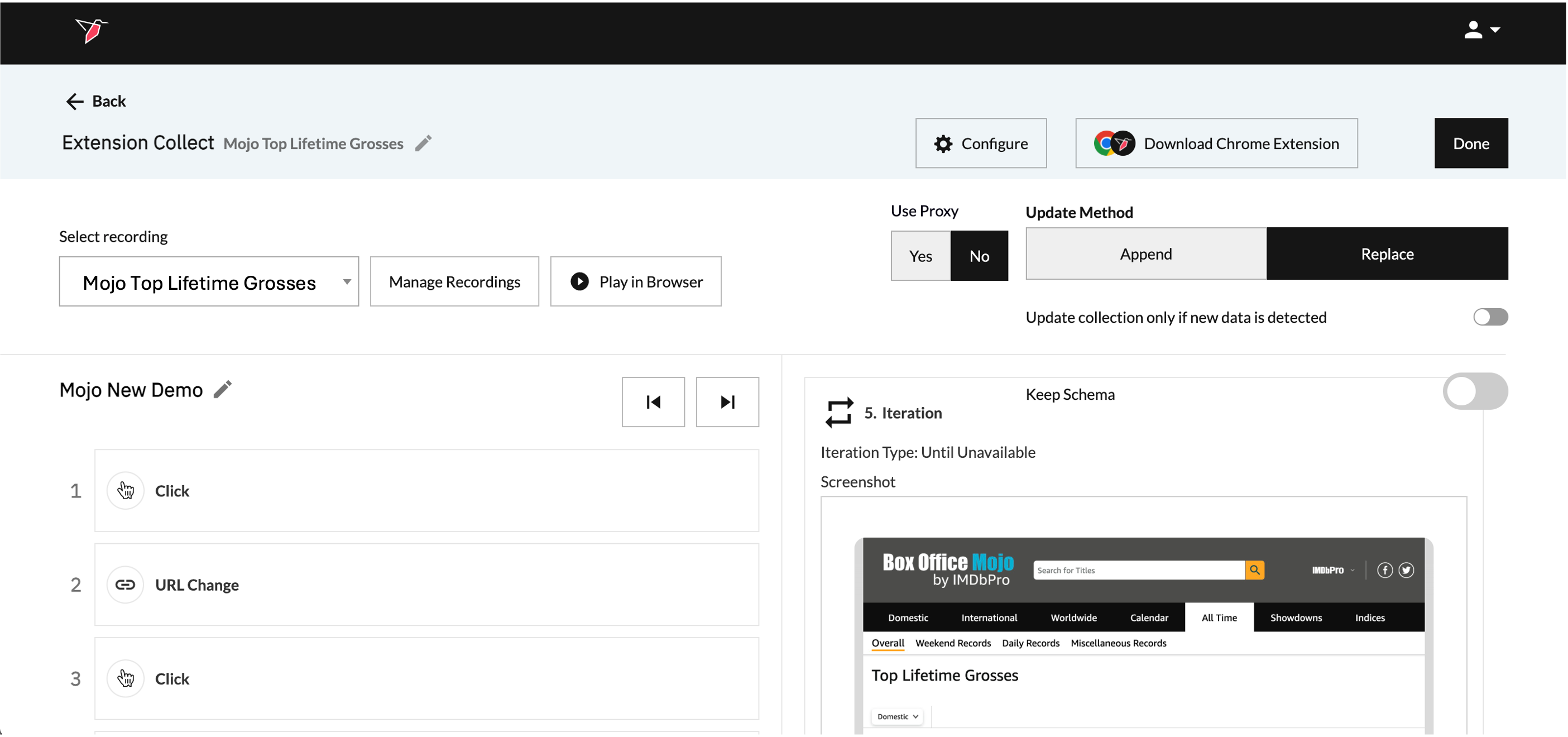 - Here you will have a preview of the step-by-step recording for you to review. You can also select using the toggle in the top right if you wish to append or replace the data each time it is run. Once you have finished reviewing, click Done.