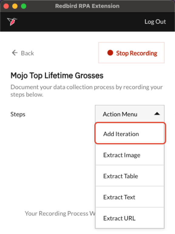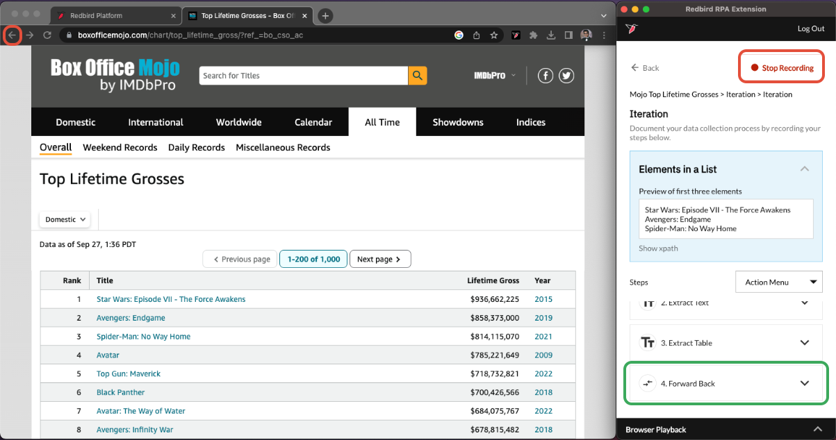 Now let's finish up! We want the RCE to know that once we are done gathering data on the linked website, to go back to the original table and continue iterating over it. Click on the back button<- of the Chrome window. This will populate a Forward Back pill in the RCE plugin. Click Stop Recording. Now we are ready to collect the data in the next step.