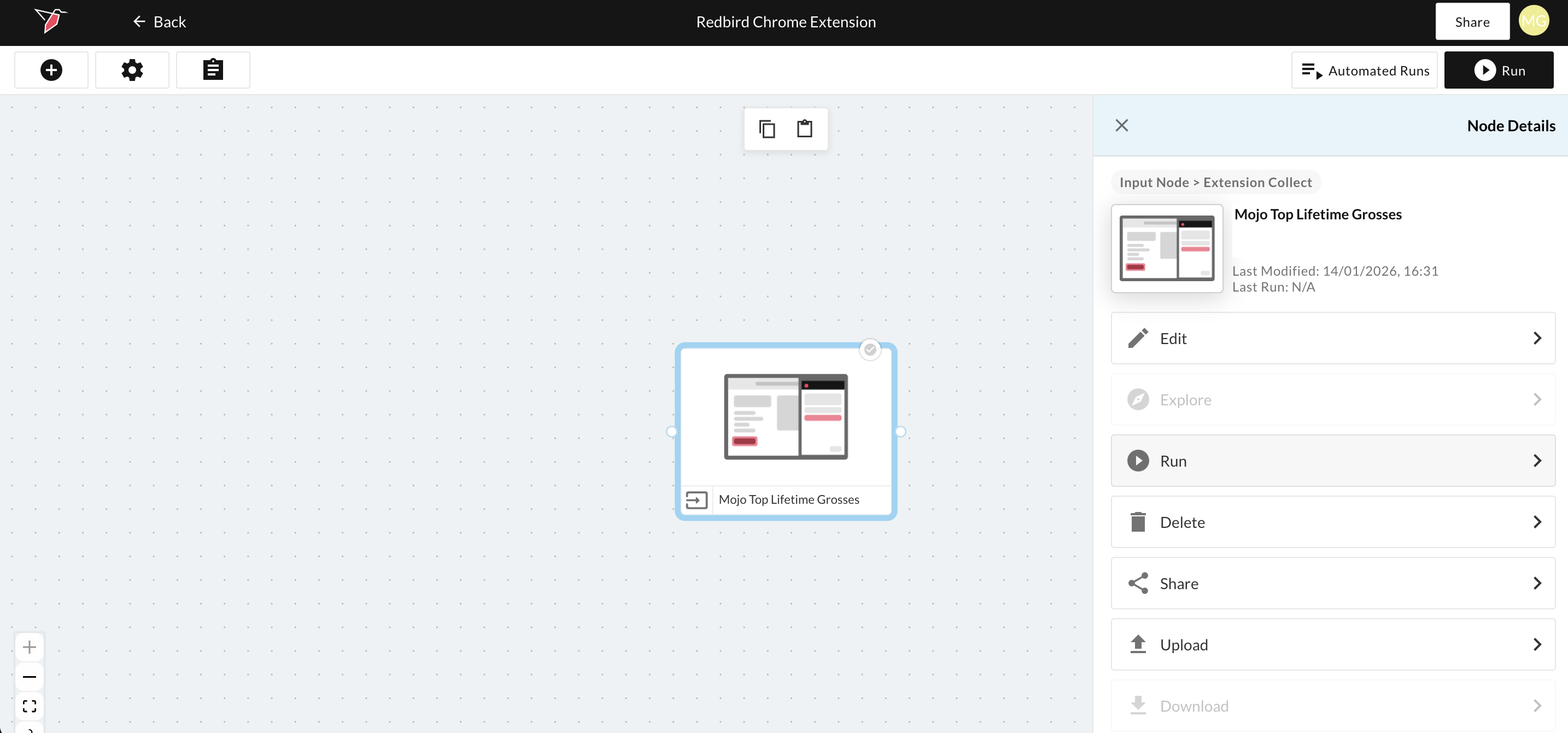 - Back on the workflow canvas, click on the node again to select it, then click Run in the right-side panel to collect the data.