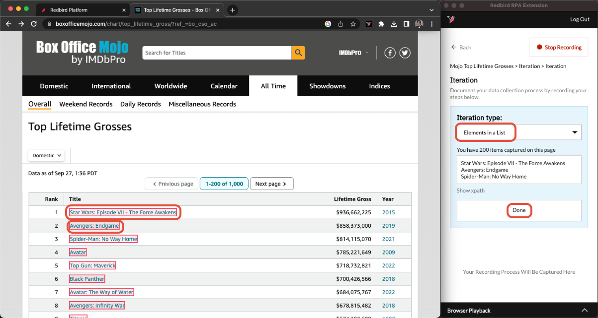 For this, we will use the Action Menu again and Add Iteration. This time select Elements in a List. Then go to the website and click on the first movie title and the second movie title. After you select those 2 items, the rest of the titles should become selected and you will see them populate in the preview of the RCE plugin. Click Done.