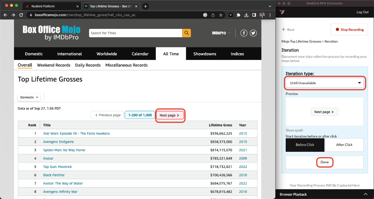 Expand the iteration box and then select Until Unavailable. Then go to the website we have on the left and click on the Next Page button. It should be highlighted with a red box when you select it. Once selected, it will populate in the preview in the RCE plugin window. Click Done.
