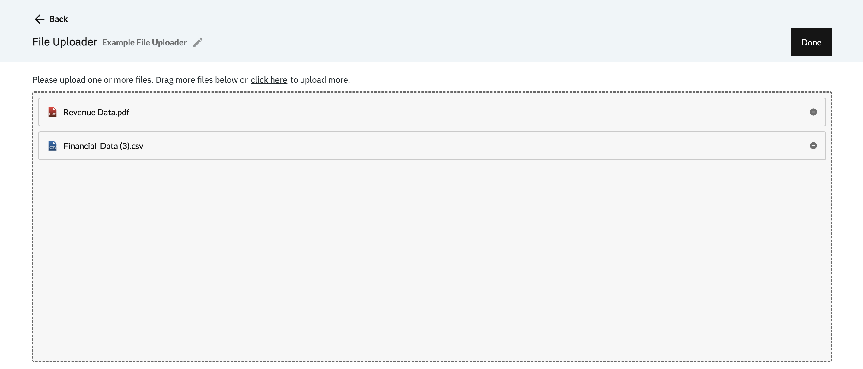 - Once the upload finishes, you will see the file(s) as rows in the box. At this point, if required, you can remove any uploaded file by clicking the minus icon.