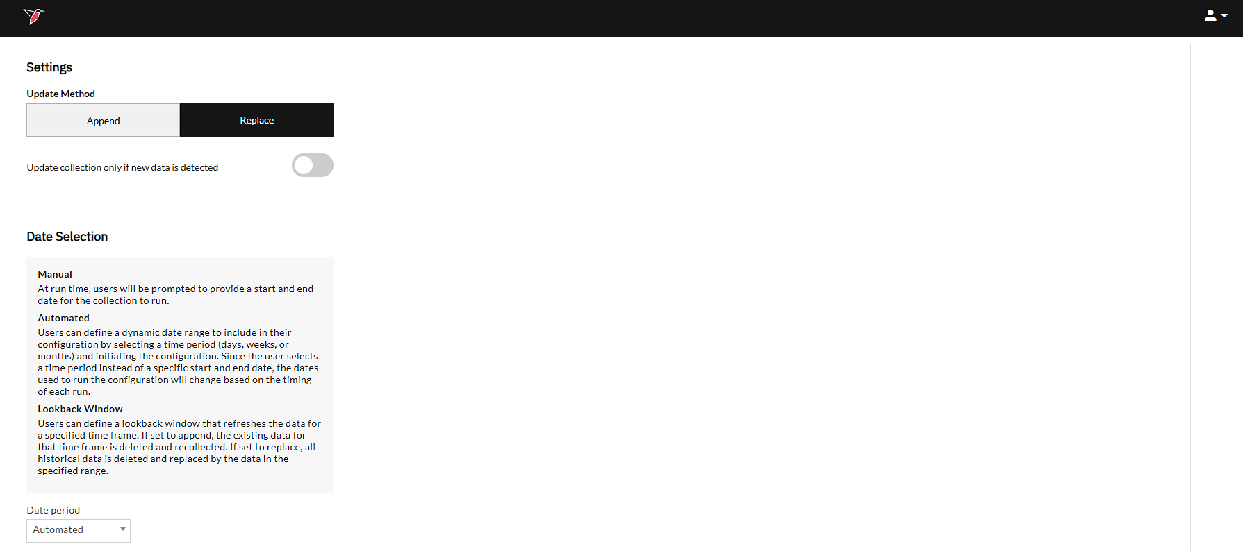 - Lookback Window: Users can define a lookback window that refreshes the data for a specified time frame. If set to append, the existing data for that time frame is deleted and recollected. If set to replace, all historical data is deleted and replaced by the data in the specified range.