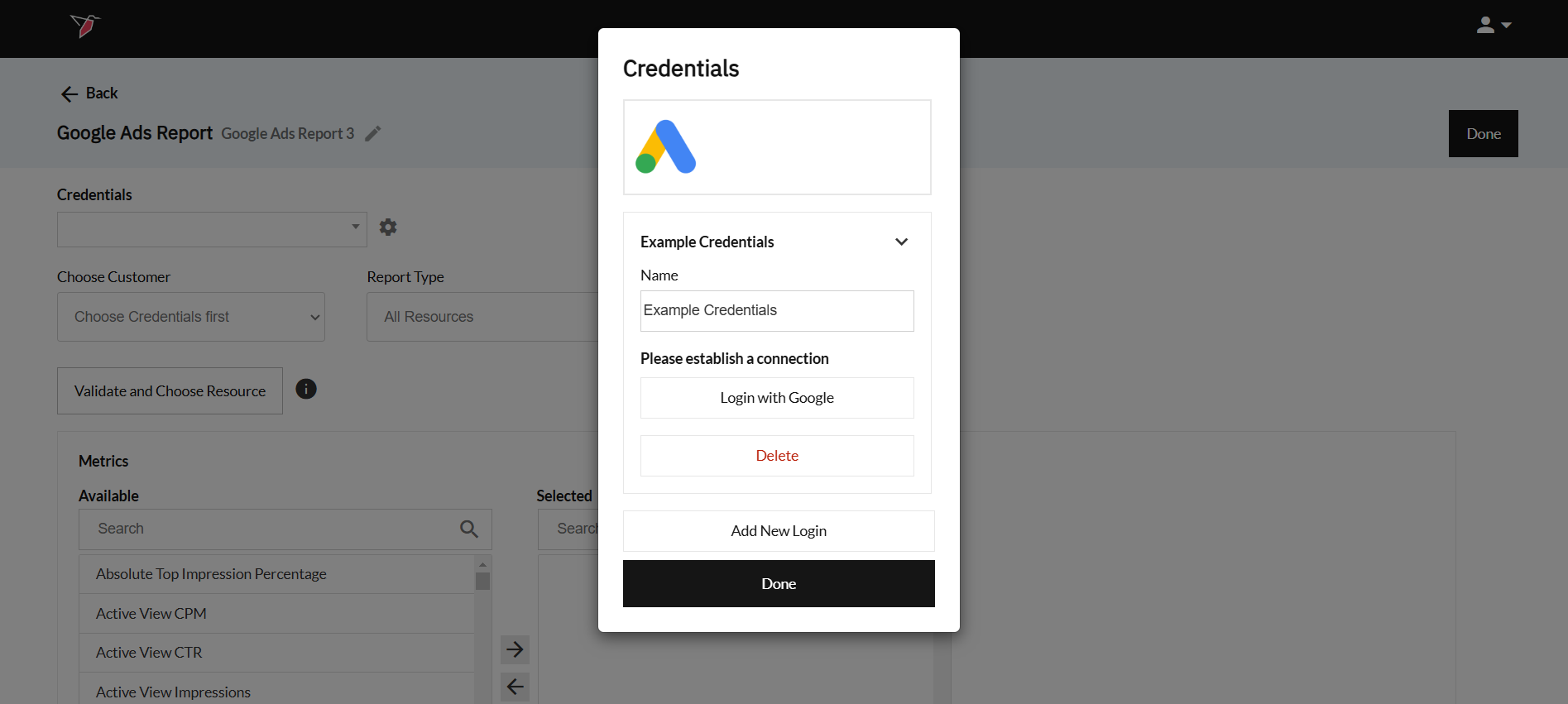 - The customers shown are the ones that have been directly shared to the Google Account used to log in. In some cases, a Google Ads Manager Account may appear in this Available box - selecting a Manager Account will run the report for all customers within that account.