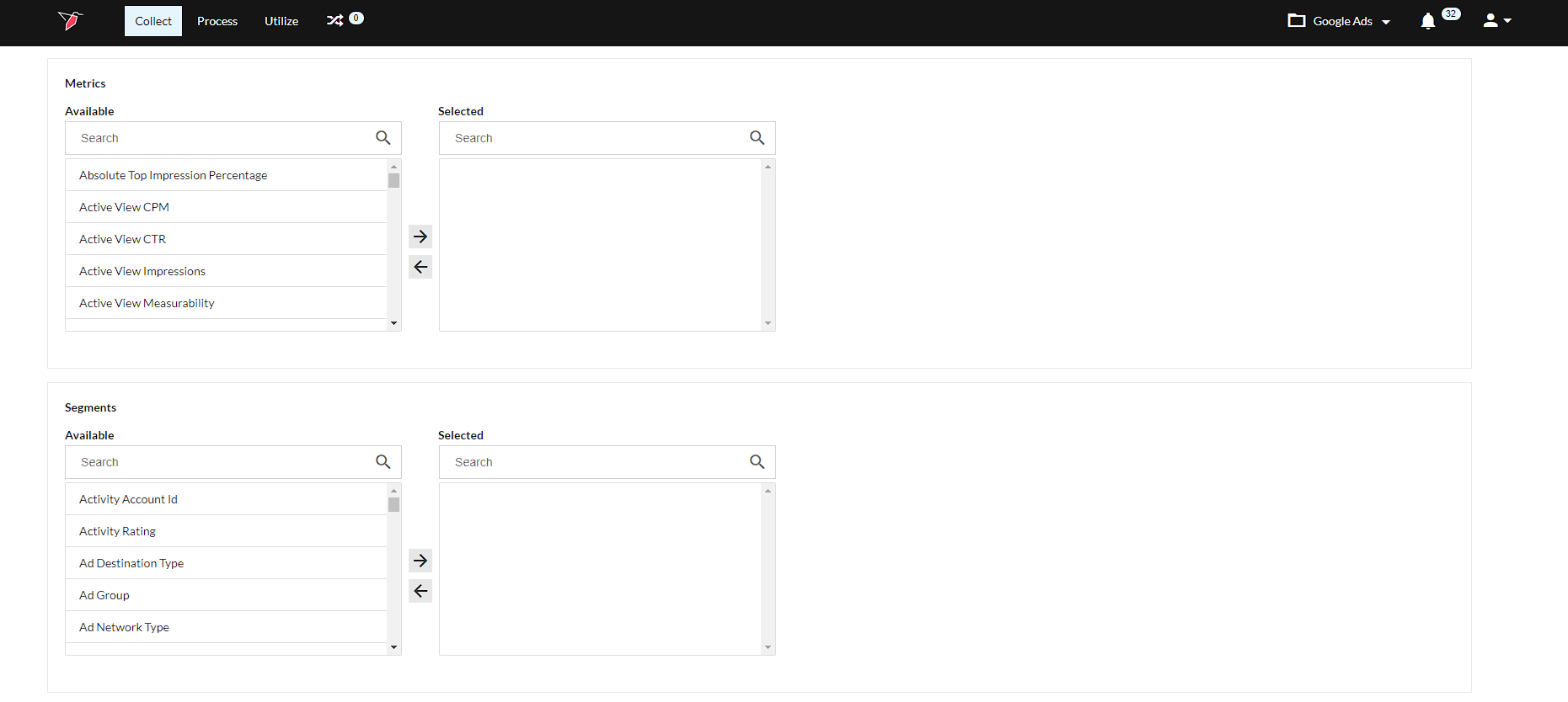 Under Metrics, Segments, and Dimensions, the available options for the selected view will populate in the Available box. Select the options you need and click the top arrow to move it to the Selected box.\