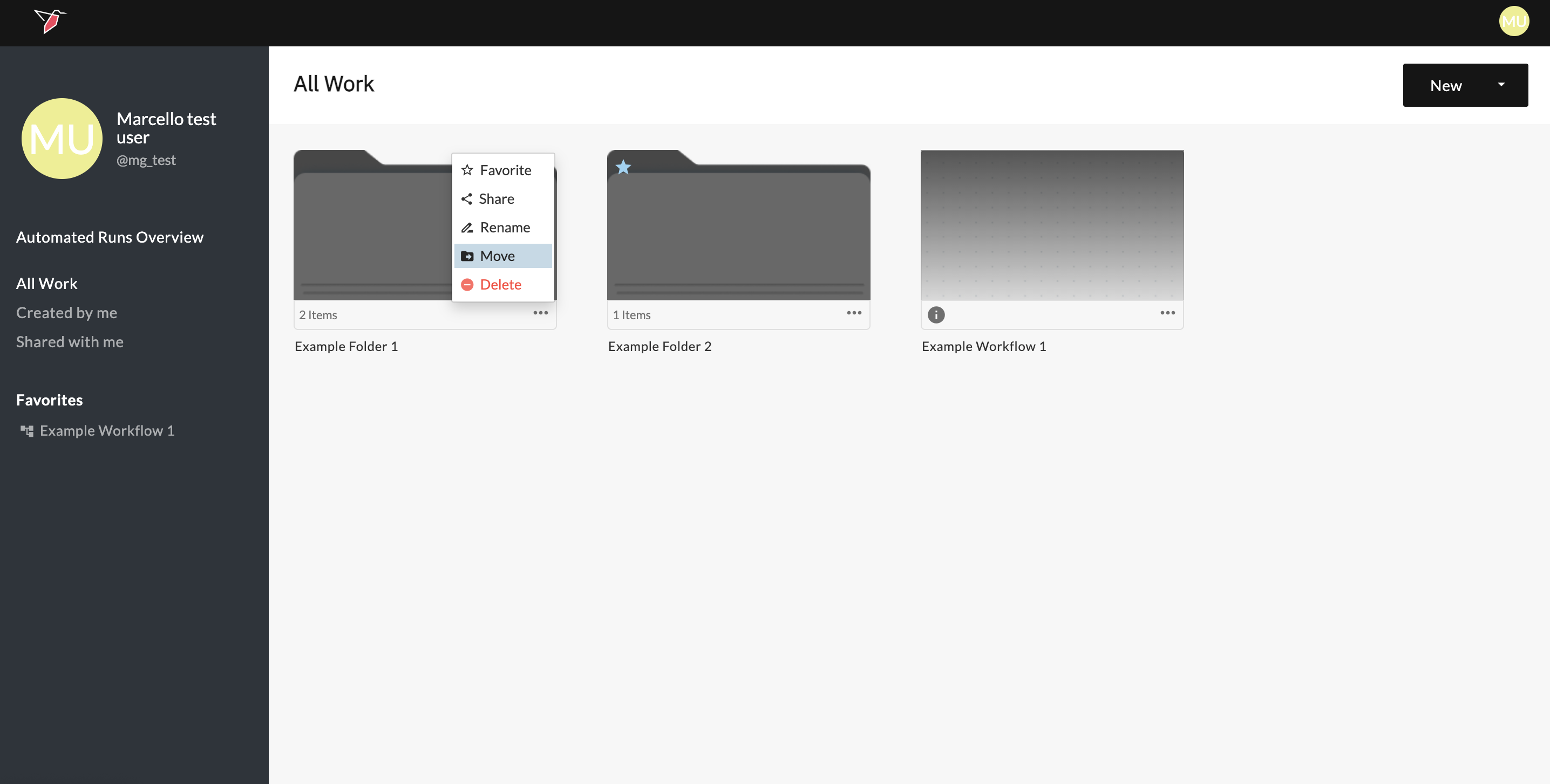 - Click the three dots in the bottom-right corner of the folder or workflow canvas you want to move, then select Move.
