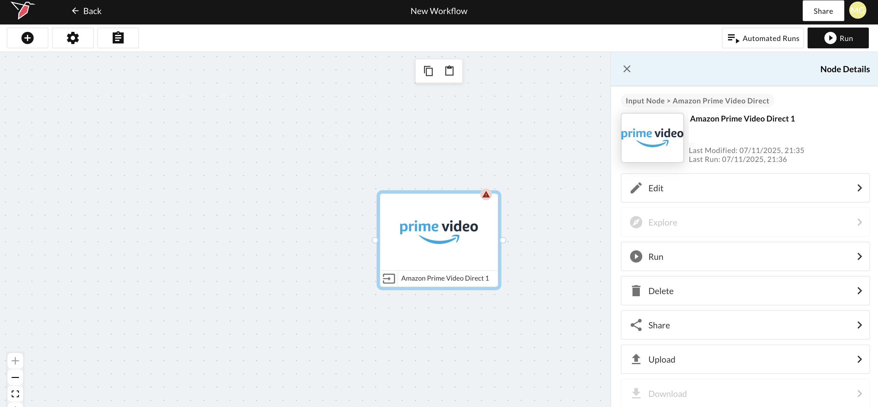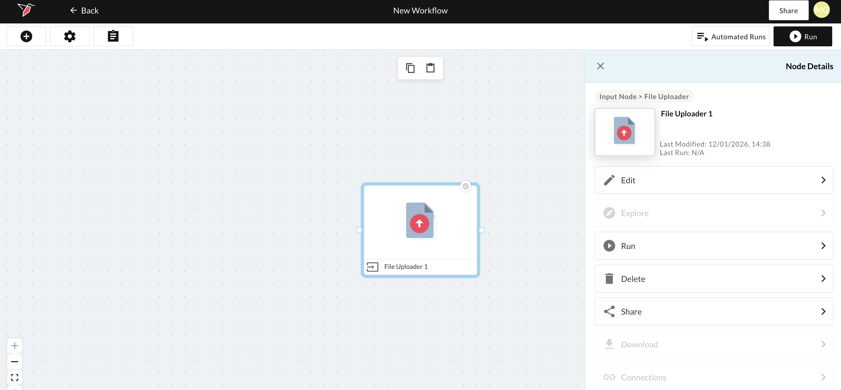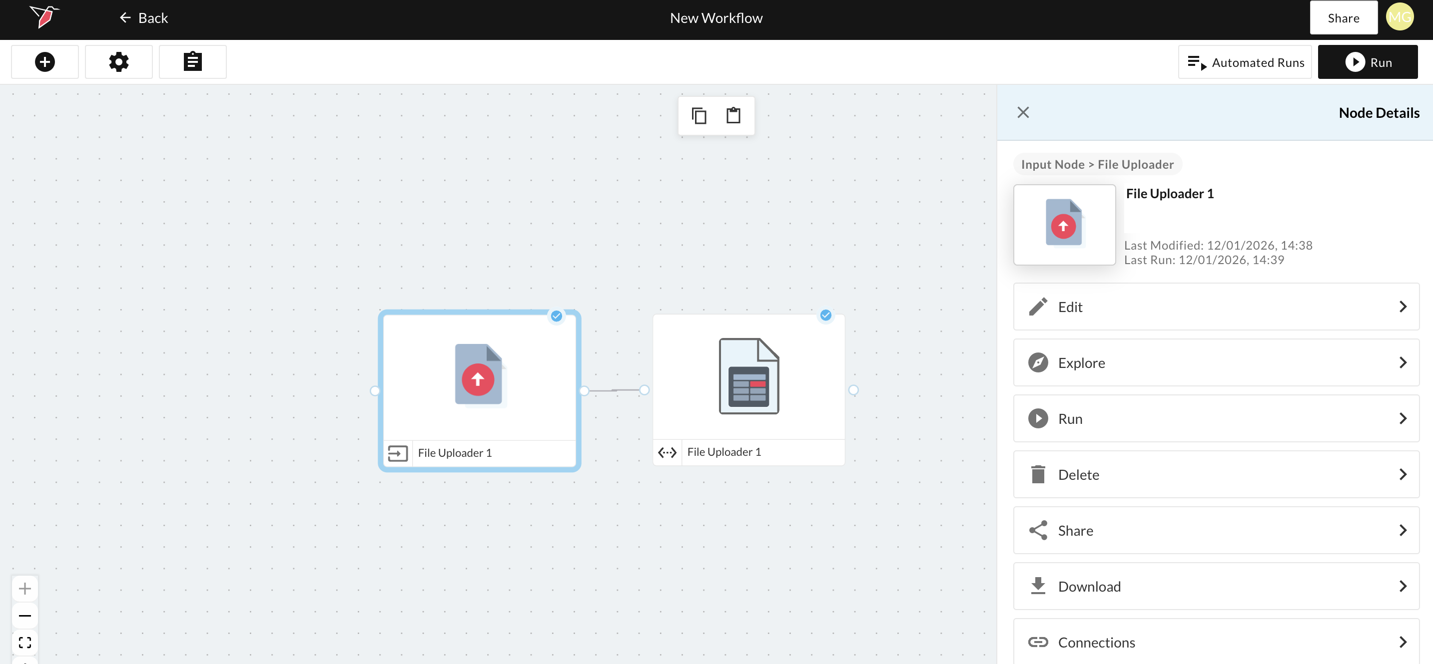 - Run the node manually using the Run option in the right-hand panel or include the node in an ad hoc run or automated run. See here for more information on running nodes.