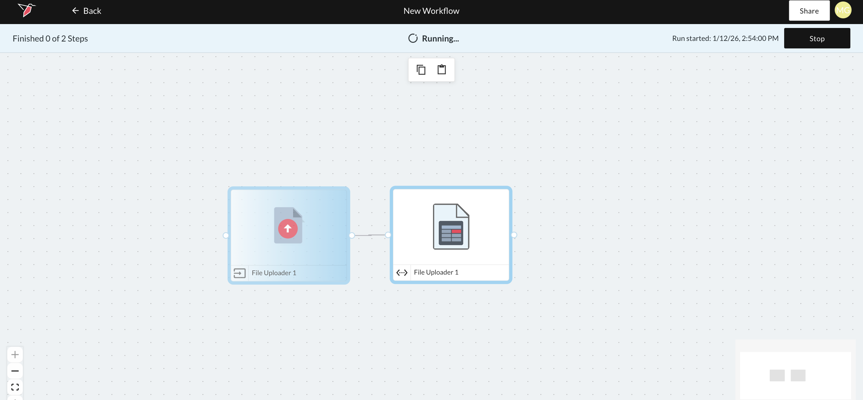 When you run a node or multiple nodes as part of a workflow, a run status banner appears at the top of the canvas. This banner reflects the overall state of the workflow during execution and complements the individual node status indicators on the canvas.
