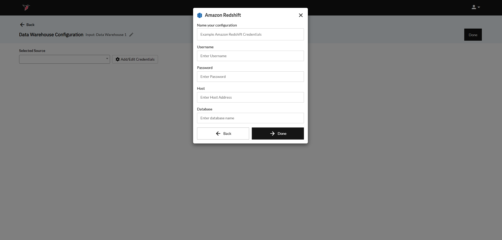 - Input the login credentials. These credentials will be the same username and password used to log into the Amazon Redshift platform.