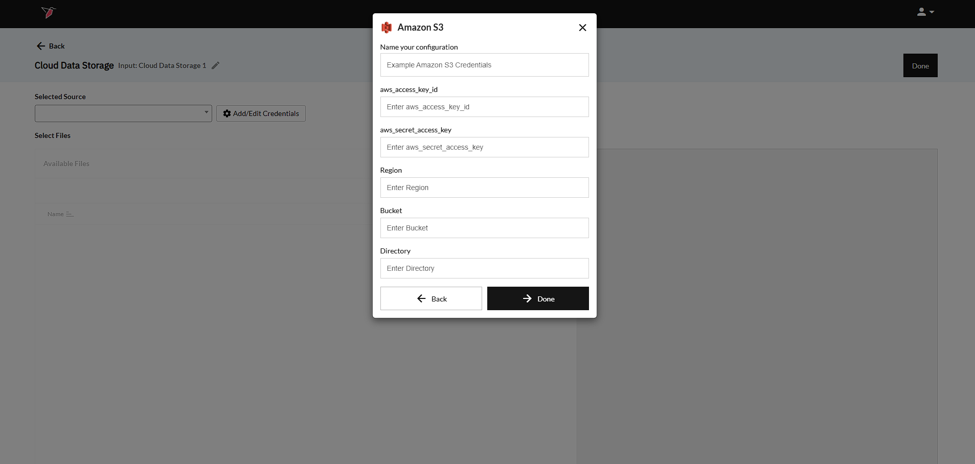 Note:For Amazon S3 specifically, AWS access key id, AWS secret access key and Region (e.g. us-east-1) are mandatory fields.