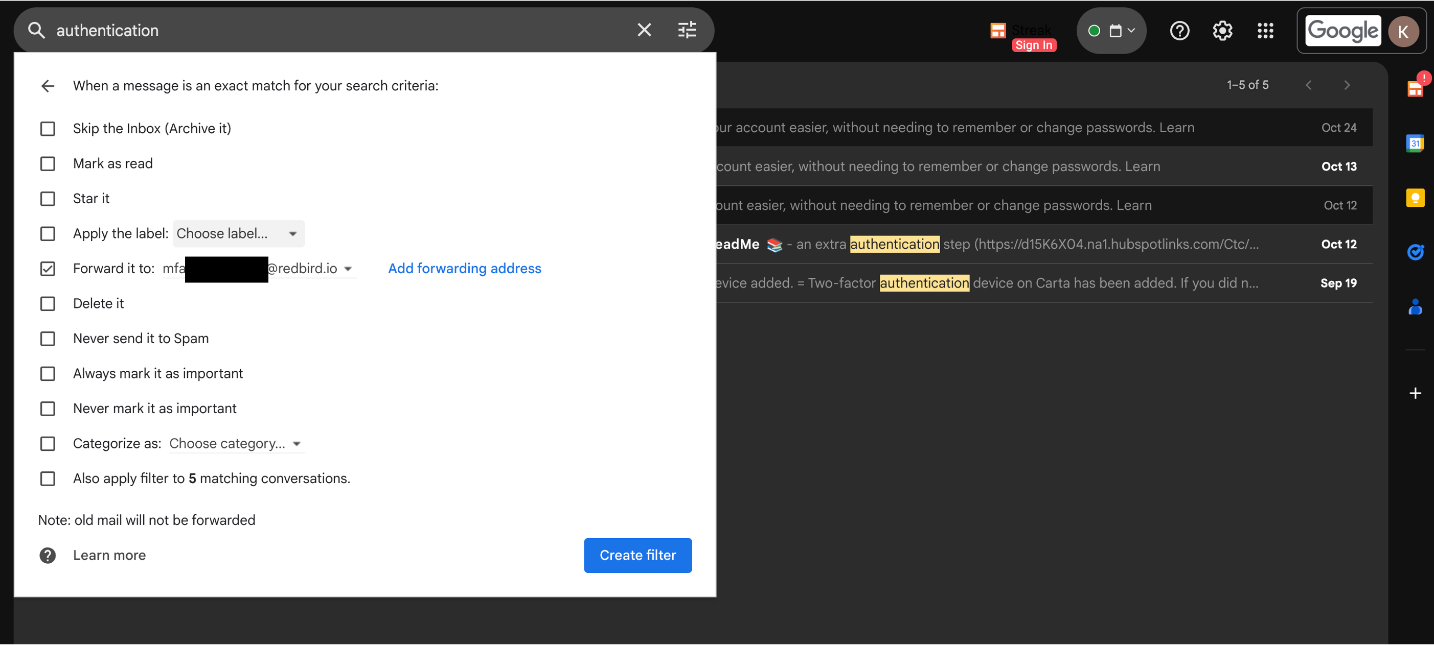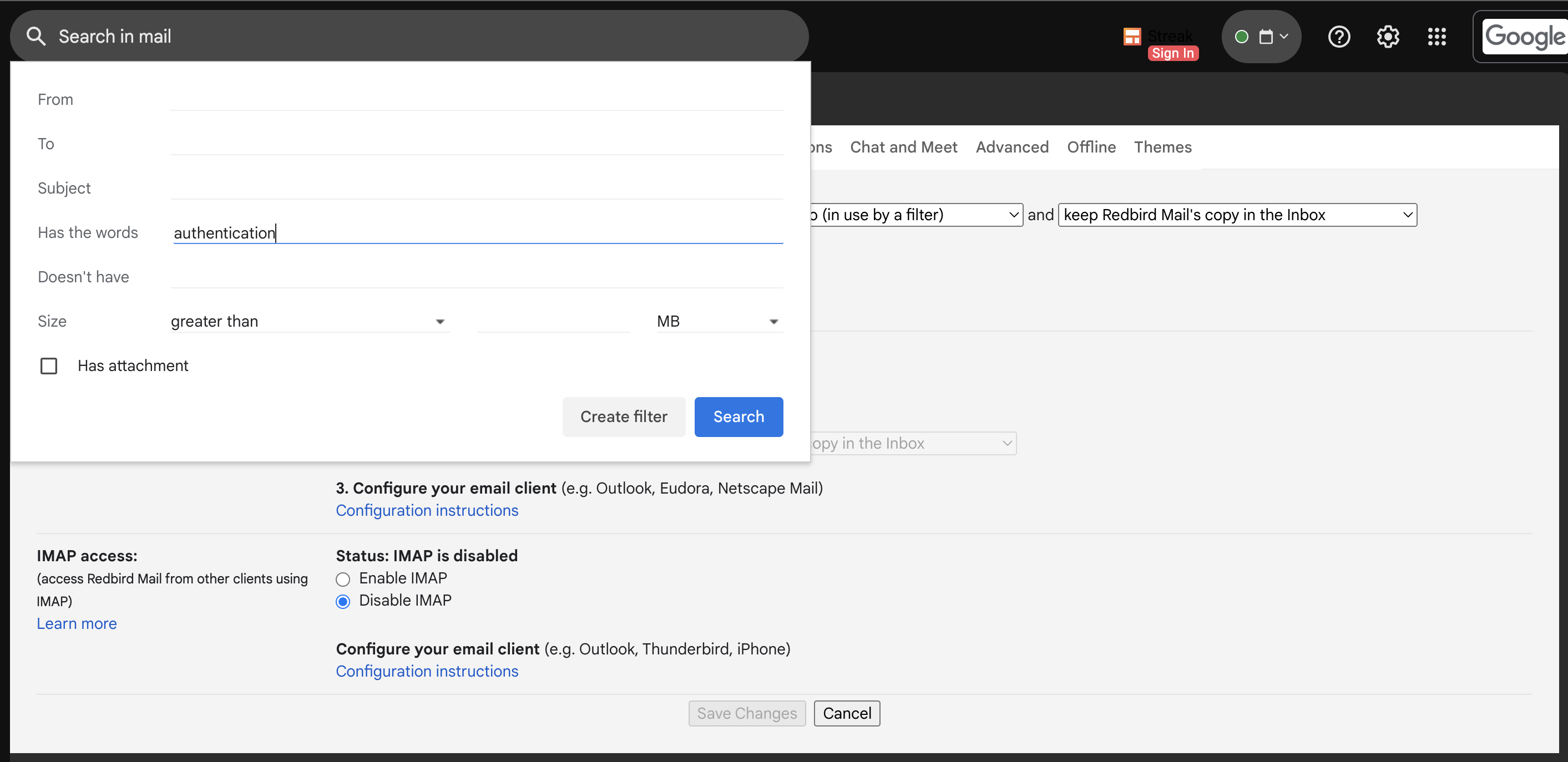 - Within the filter setting window, add the rules that you would like. In the below example, we put "authentication" in the Has the words section. Once complete, click Create filter.