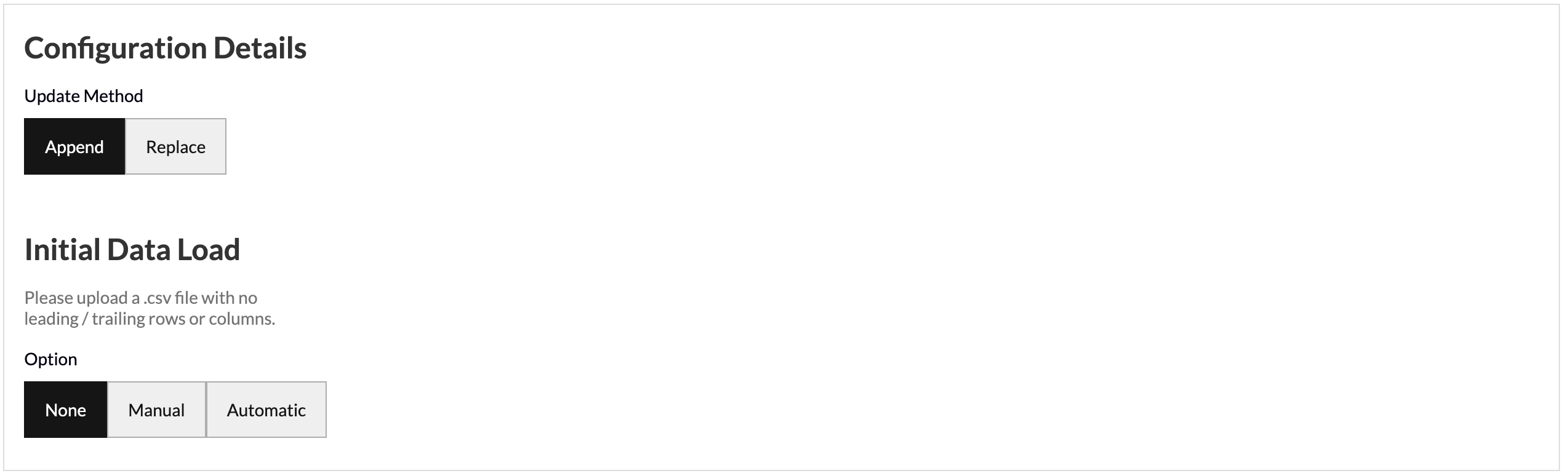 - Initial Data Load allows you to upload historical data in bulk as a one-off in the event that you have the data saved on your computer. You can upload your data as a CSV file with no leading/trailing rows or columns and Redbird will run future data collections using the configuration that you set up in previous steps.
