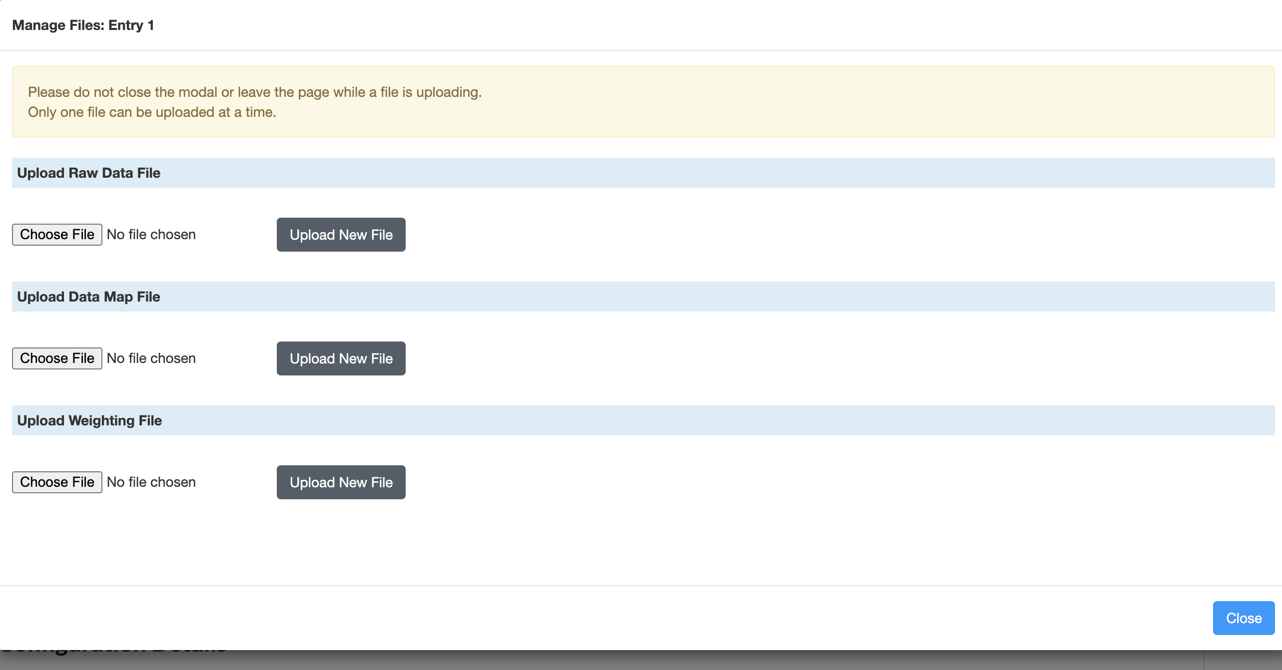 - Click Close to return to the main page when all files have been uploaded.