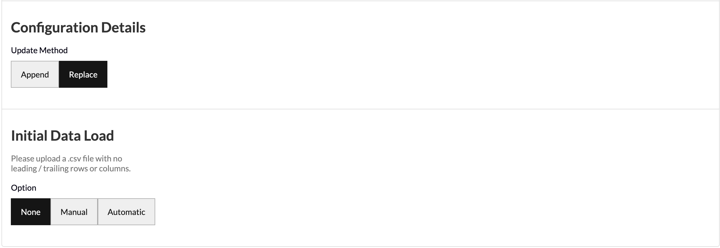 - Initial Data Load allows you to upload historical data in bulk as a one-off in the event that you have the data saved on your computer. You can upload your data as a CSV file with no leading/trailing rows or columns and Redbird will run future data collections using the configuration that you set up in previous steps.
