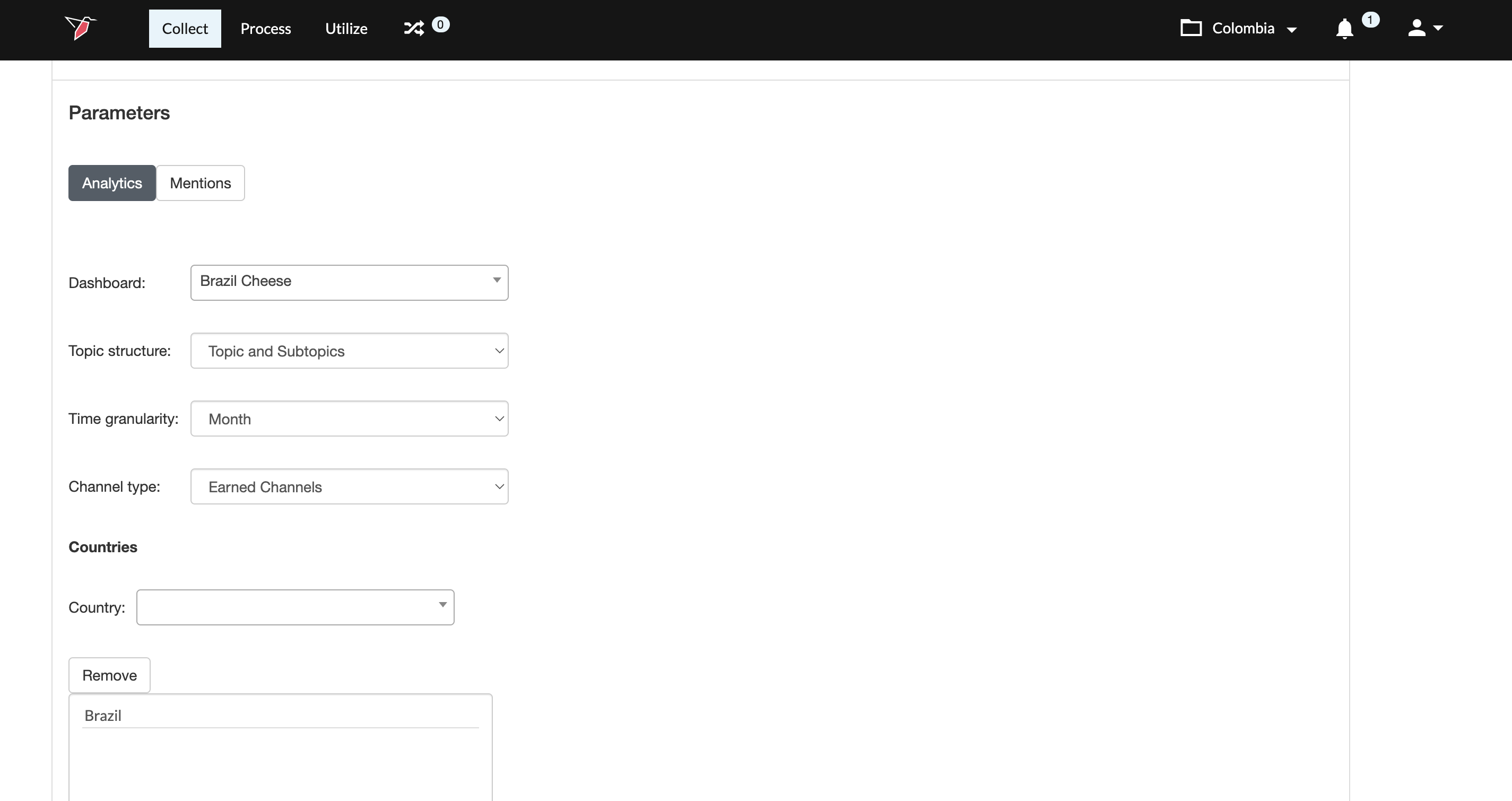 - In the Parameters section you can choose to pull Analytics (just the metrics) or full Mentions themselves.