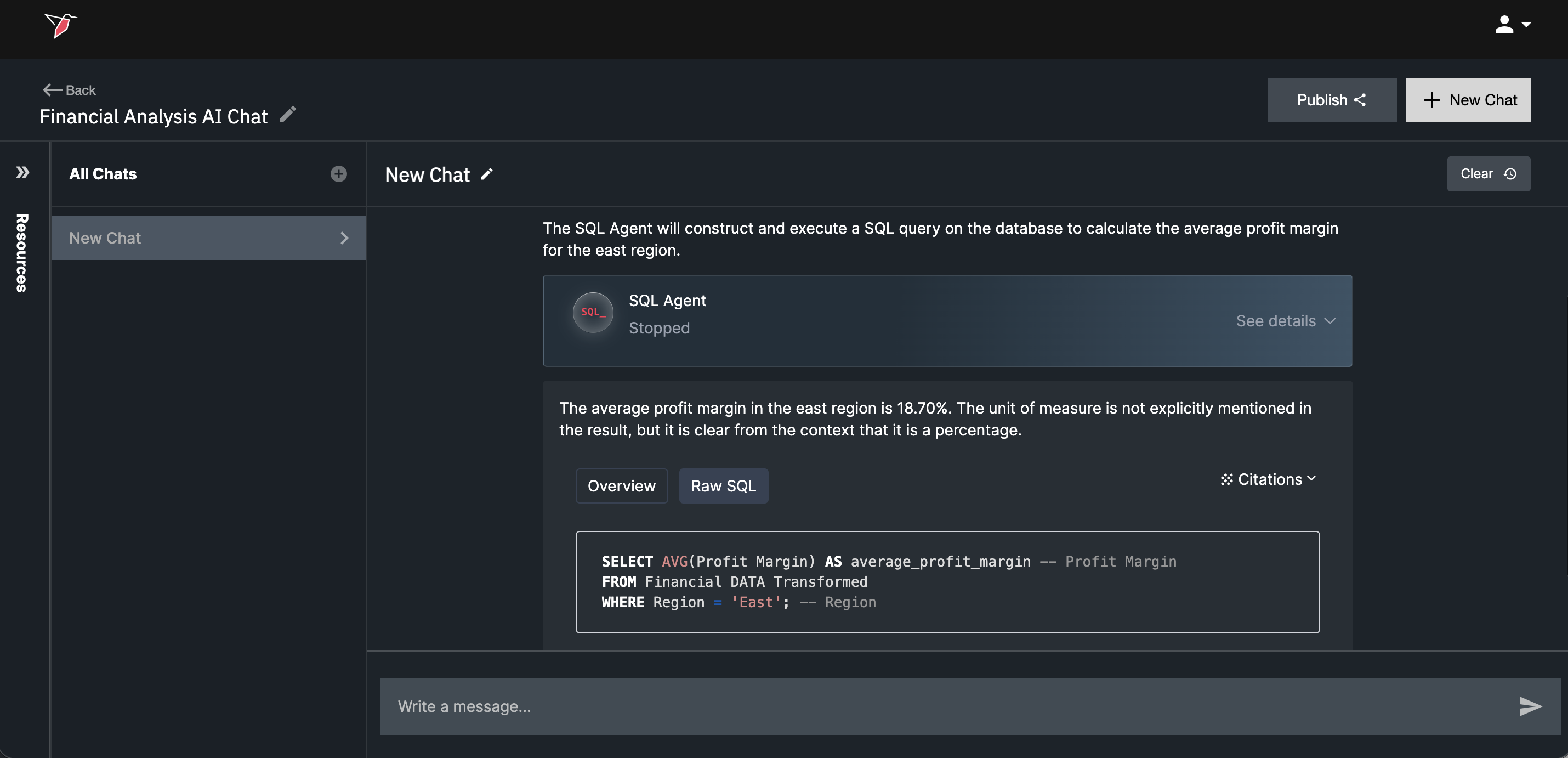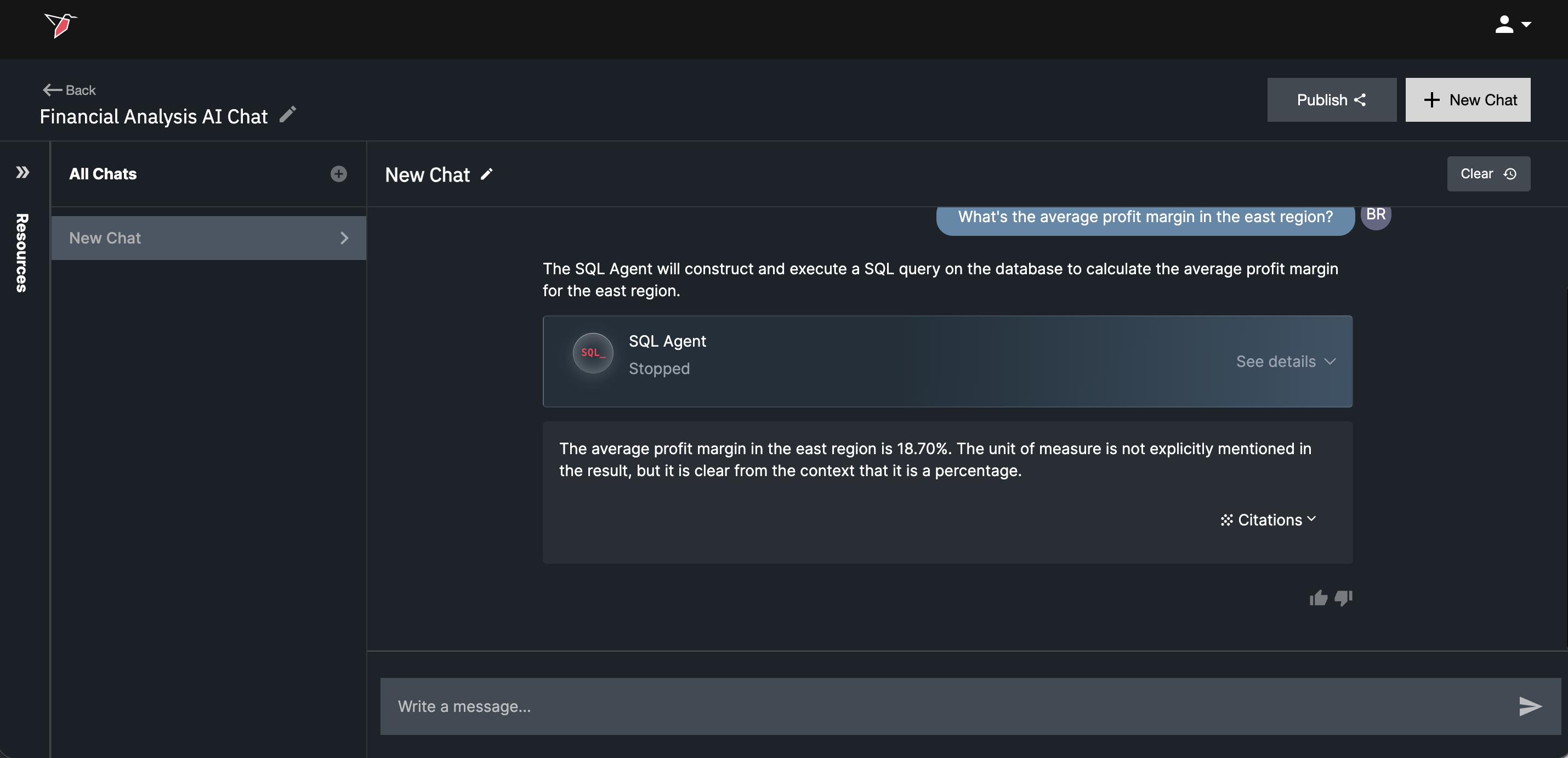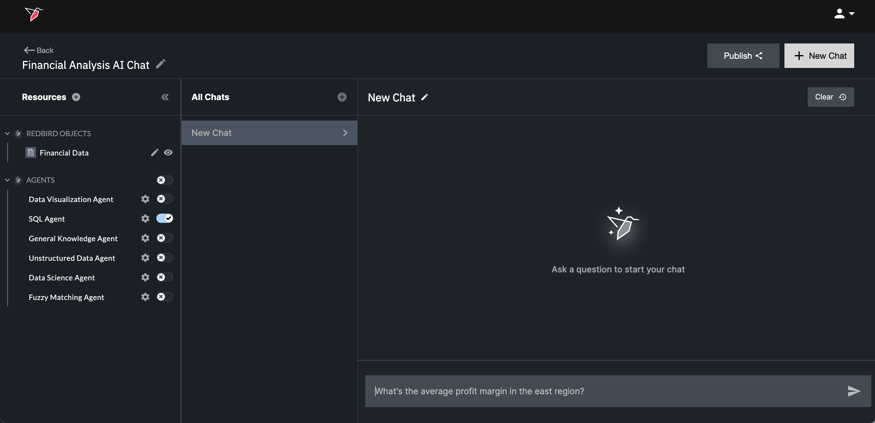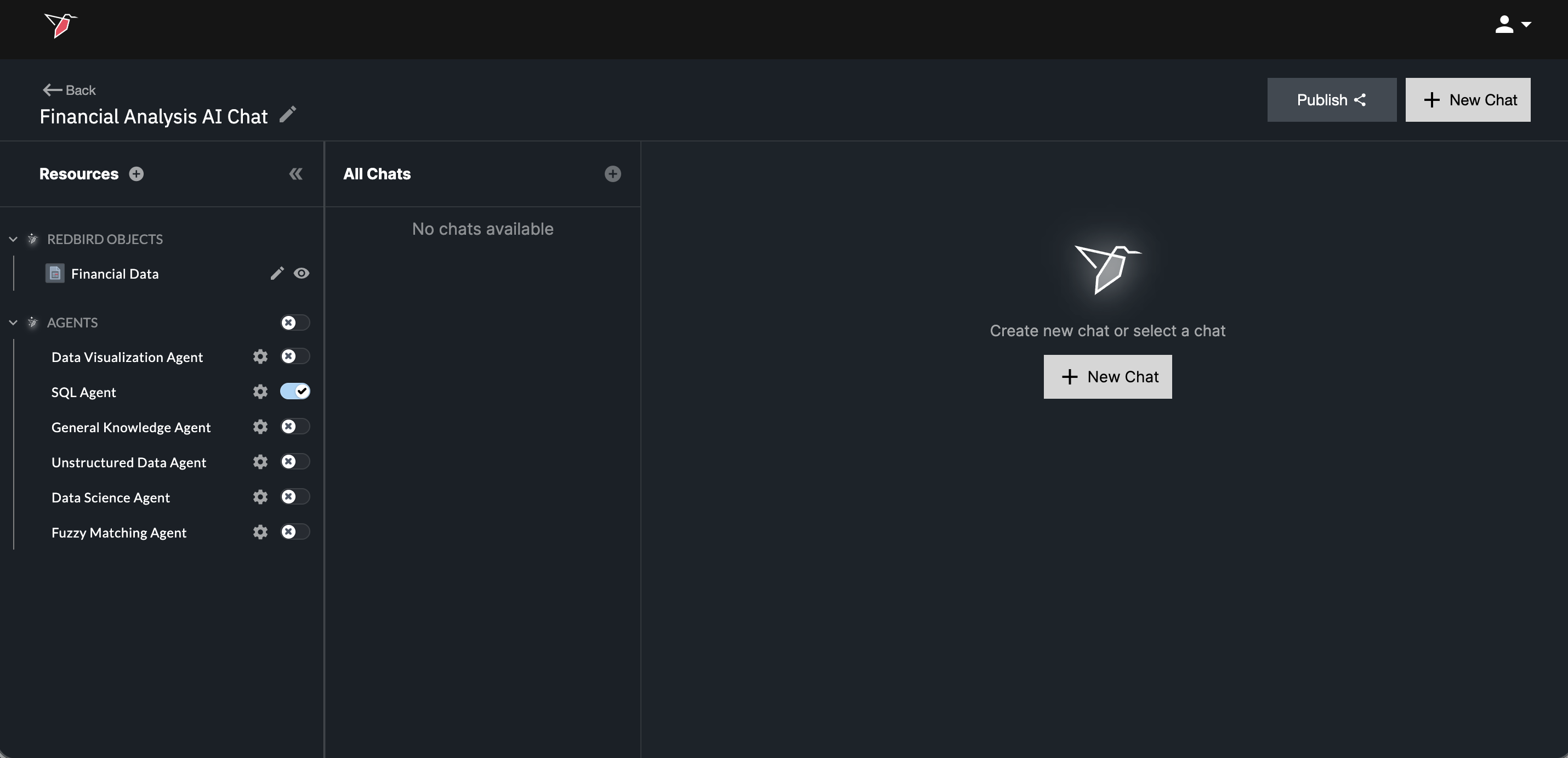 - Double-click the AI Chat node and name it "Financial Analysis AI Chat". In the Resources panel, you’ll see all agents enabled for your Redbird account. By default, all agents are toggled on. For this tutorial, toggle on only the SQL Agent and leave the others toggled off.