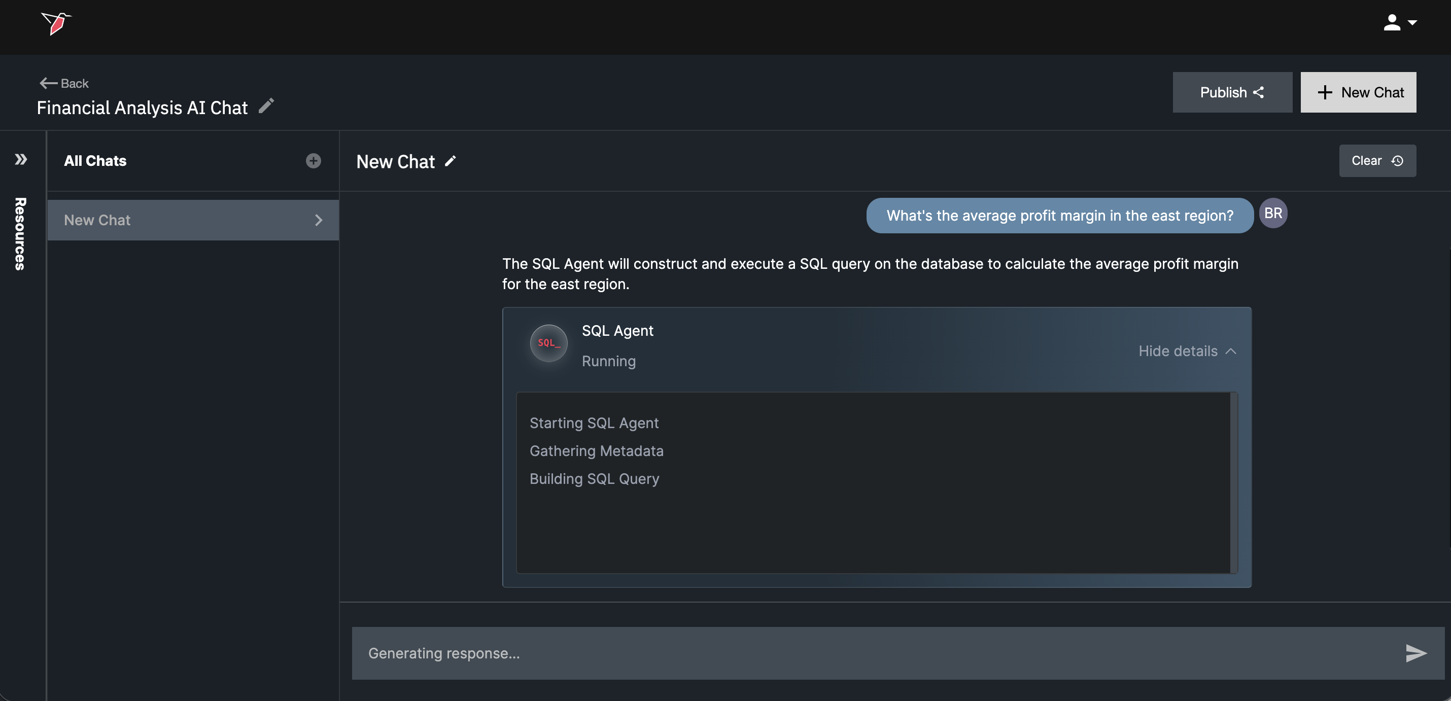 - After you submit a question, you’ll see the response being generated. As it runs, the chat will also show you the step-by-step actions it’s taking in the AI Agents Internal Updates window.