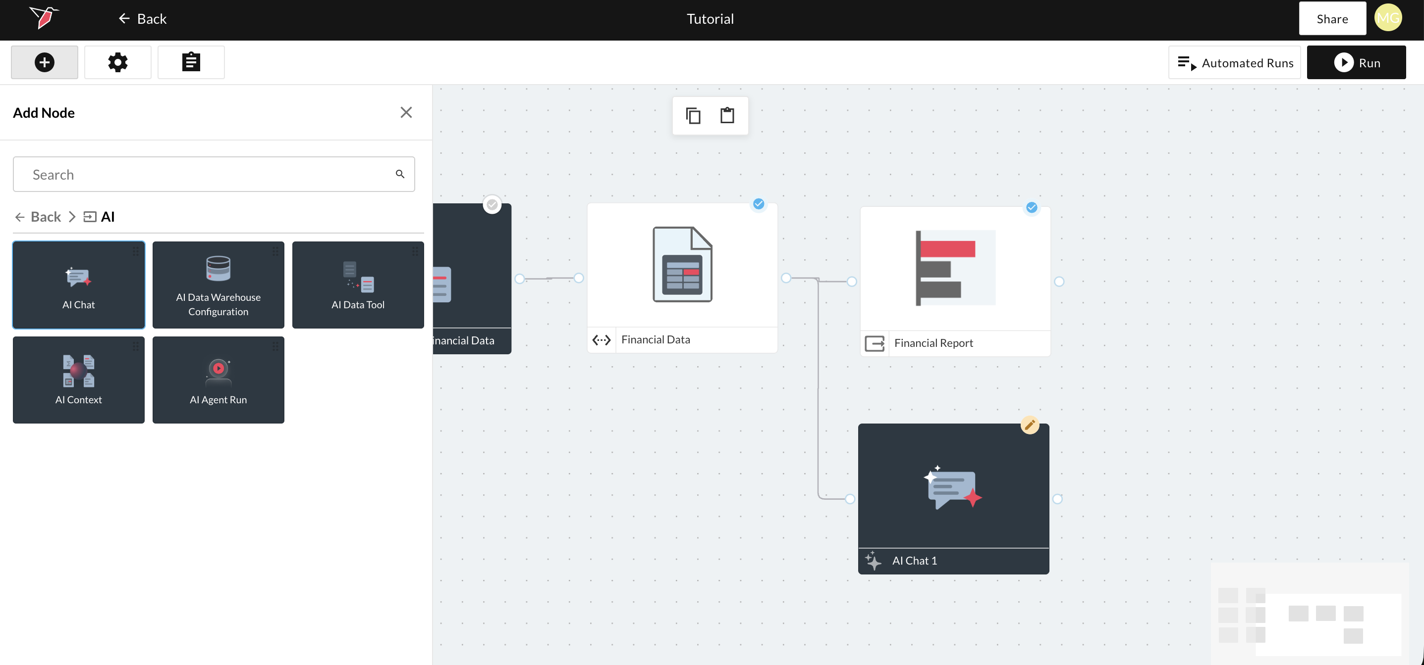 - Open the panel to the left by clicking the plus icon in the top left of your screen. Select AI and drag and drop an "AI chat" node onto the workflow canvas. Connect it to the output dataset produced by the AI DT node: "Financial Data".